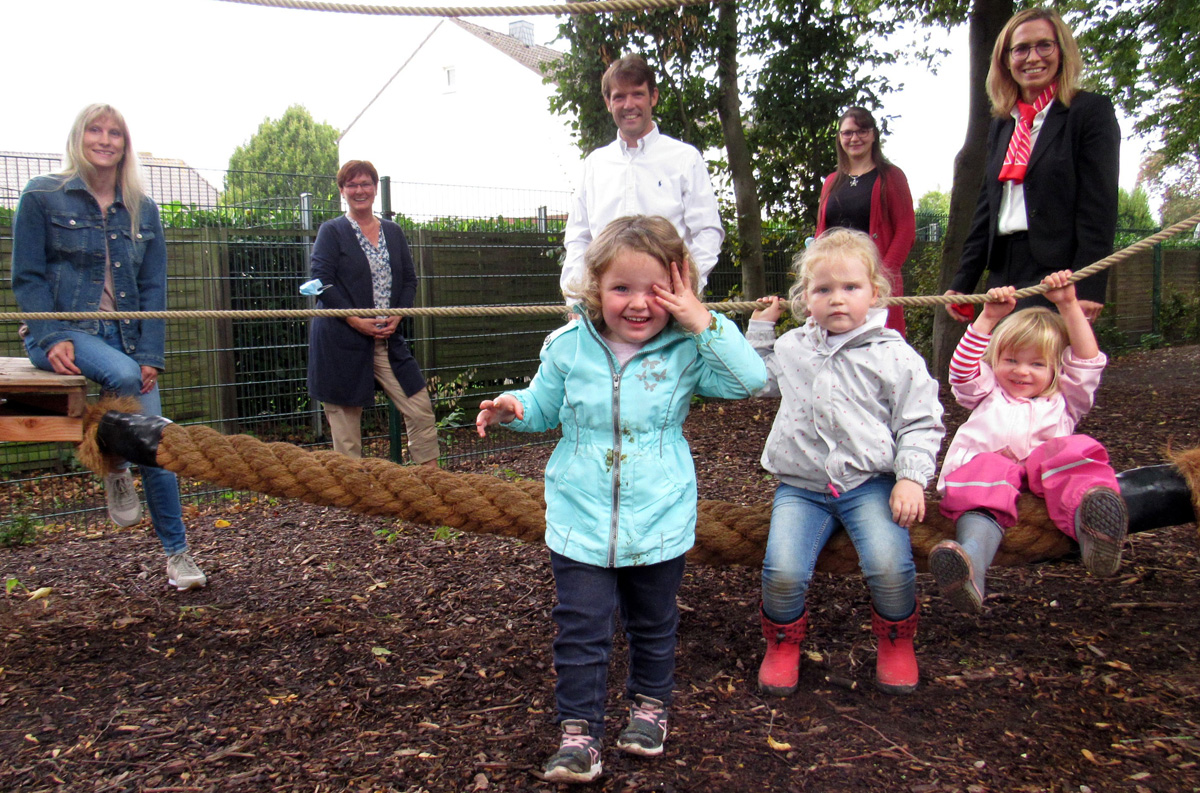 Seit ein paar Tagen ist der neue Niedrigseilgarten in der Ev. Integrativen Kindertagesstätte an der Niersstraße in Betrieb. „Es war immer ein Traum von uns“, sagt Esther Müller, Leiterin der Ev. Kindertagesstätte. Hintergrund: Seit zwei Jahren ist die Kindertagesstätte ein „Bewegungskindergarten“. Das bedeutet, Bewegung wird in den Alltag integriert. Die Einladung dazu lassen sich die Kinder im Niedrigseilgarten nicht zwei Mal sagen. „Sport und Bewegung sollen nicht nur nach Aufforderung in der Turnhalle stattfinden“, meint Müller. Sie ist dankbar ist für die finanzielle Unterstützung der Sparkasse, des eigenen Fördervereins und nicht zuletzt der Ev. Kirchengemeinde Goch. Denn sie trat für das Konstrukt einen Teil der Fläche ab, die bislang zum Seniorenzentrum an der Parkstraße gehörte. Der alte Baumbestand eignet sich hervorragend für die Installierung des Niedrigseilgartens, den die Firma redpoint übernahm. Ein riesiger Pfahl bildet den Angelpunkt für weitere Verzweigungen der Seile im Geäst.