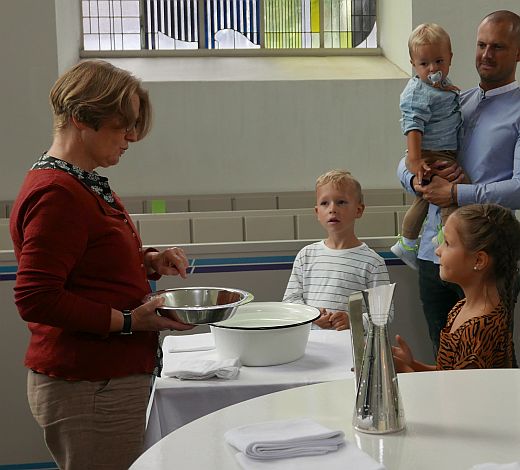 Fünf Stationen zur Tauferinnerung waren in der Kirche aufgebaut. Insgesamt elf Fünfjährige mit ihren Familien erkundeten am Samstagnachmittag, was es mit ihrer Taufe auf sich hat. Zu Beginn wurde die eigene Taufkerze angezündet und die Eltern erzählten ihren Kindern von ihrer Taufe, die für die meisten vier Jahre zurück lag. An der nächste Station stand das Wasser im Mittelpunkt. Die biblische Geschichte von der Sturmstillung erzählte Presbyterin Birgit Pilgrim. Danach erlebten die Kinder selbst, wie es ist im Sturm geborgen zu sein. Dabei war die tatkräftige Hilfe von Eltern und Pat*innen bei einer Vertrauensübung gefragt. Am Ende konnten die Kinder 'ihren' Fisch aus dem Netz in der Kirche fischen und wurden mit einem persönlichen Segen von Pfarrerin Rahel Schaller verabschiedet.